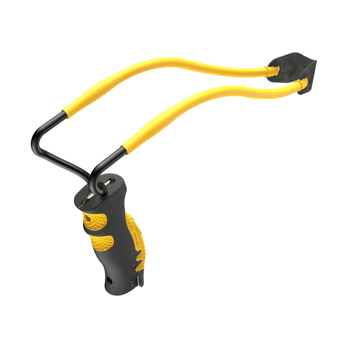 Die Schleuder verfügt über eine gebürstete Leder-Center-Shot-Munitionsaufnahme, die eine stabile Positionierung der Munition unterstützt und ein gleichmäßiges Schussverhalten fördert. Der diamantstrukturierte Soft-Touch-Griff aus TPE sorgt für sicheren Halt und angenehme Haptik.