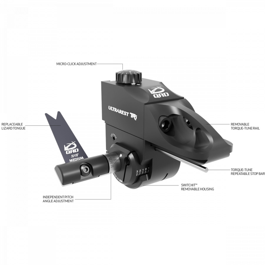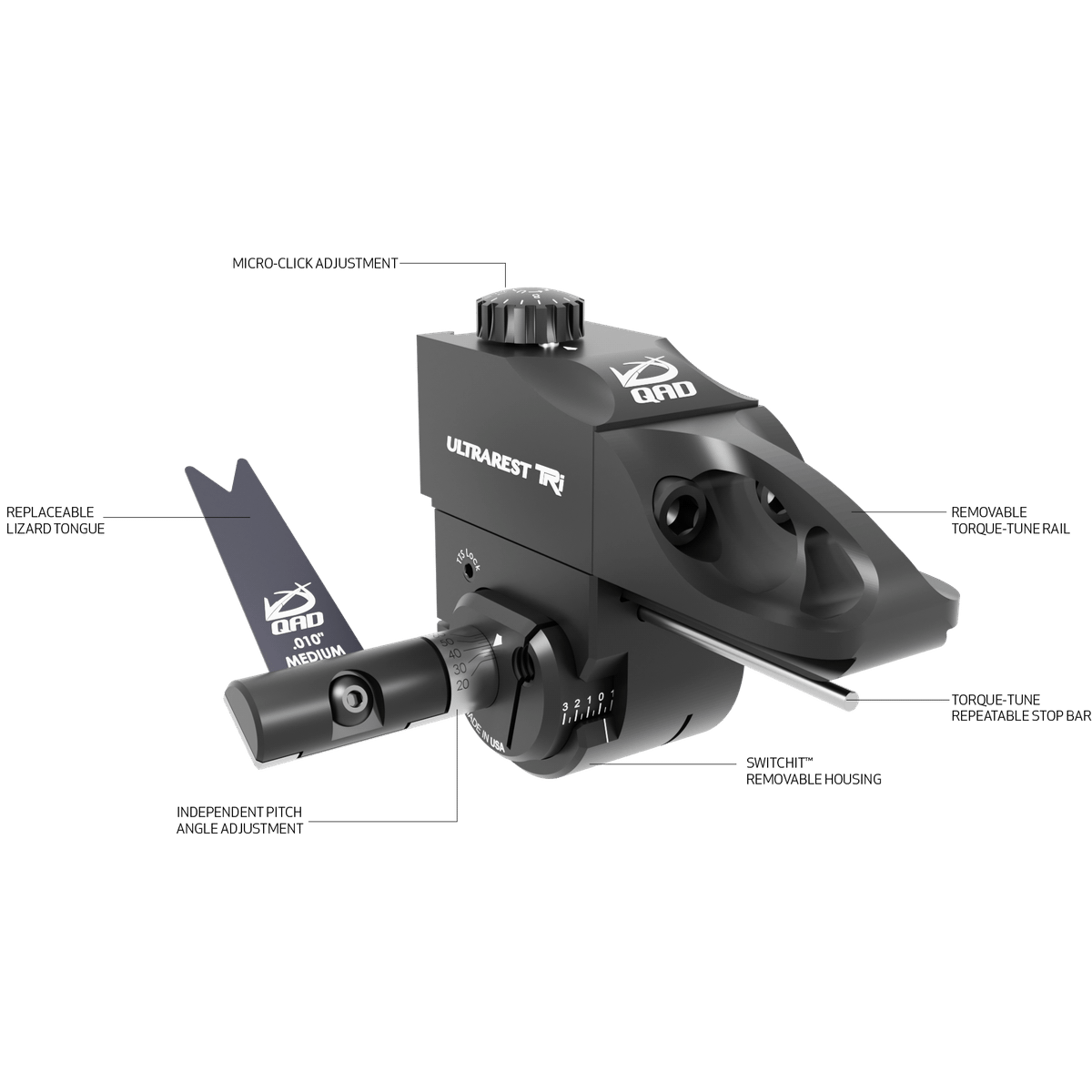 The QAD UltraRest TRI is a high-precision arrow rest designed for target archers, offering exceptional repeatability, fine adjustment, and a forgiving shooting platform that helps maintain consistency even with slight grip-induced torque.